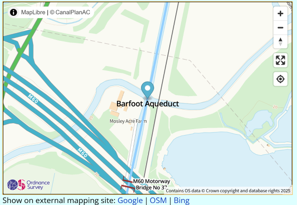 Barfoot Aqueduct is a minor waterways place on the Bridgewater Canal (Main Line) between Stretford – Waters Meeting (Junction of Bridgewater Canal Main Line and Stretford and Leigh Branch) (1 mile and 4¾ furlongs to the north) and Lymm Bridge No 23 (Lymm, footbridge is next to road bridge) (9 miles and 1½ furlongs to the west).